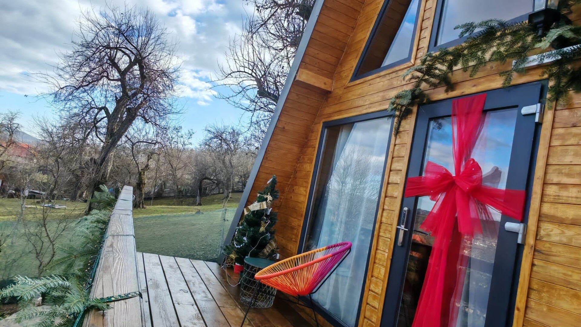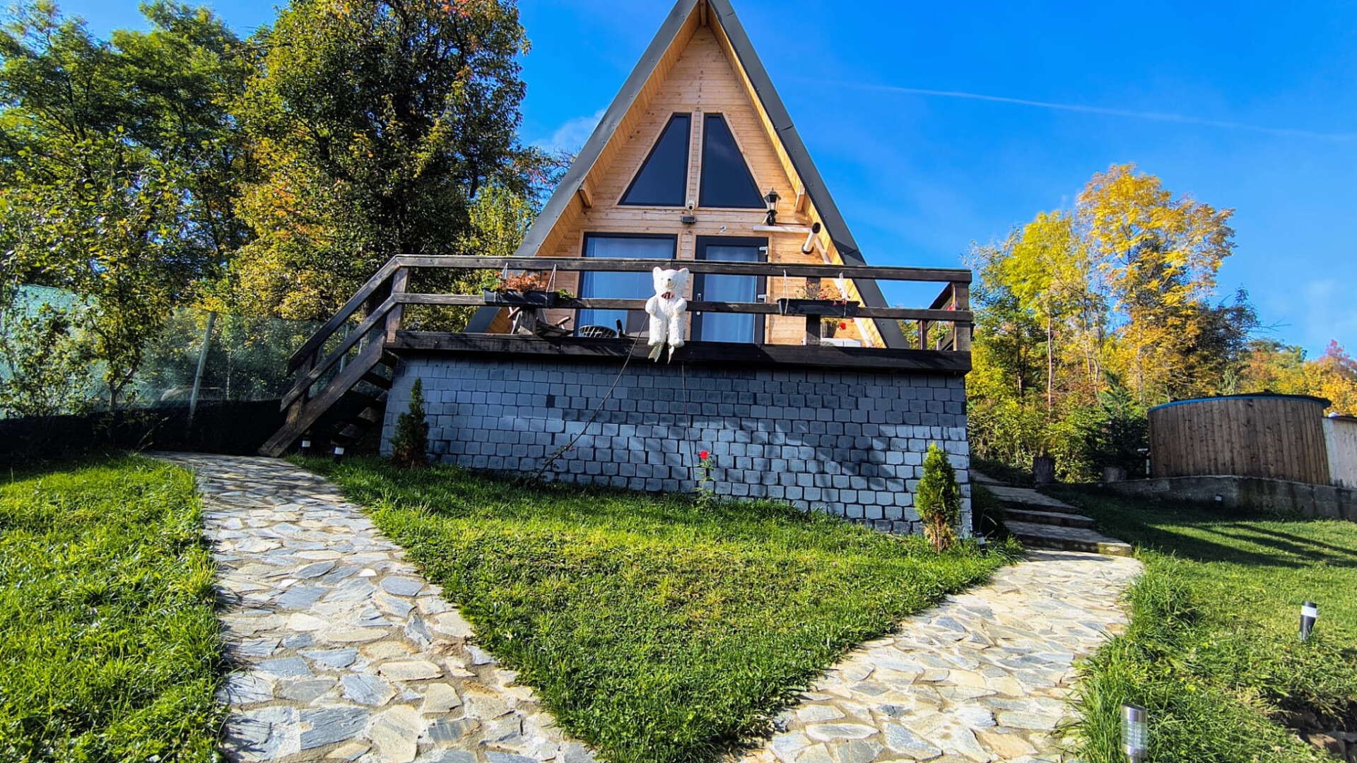Cabana A-Frame amplasată pe deal, cu terasă generoasă și orientare spre apus. Ferestrele de la podea până la tavan și priveliștea liniștită creează un cadru ideal pentru momente romantice și relaxare în doi.