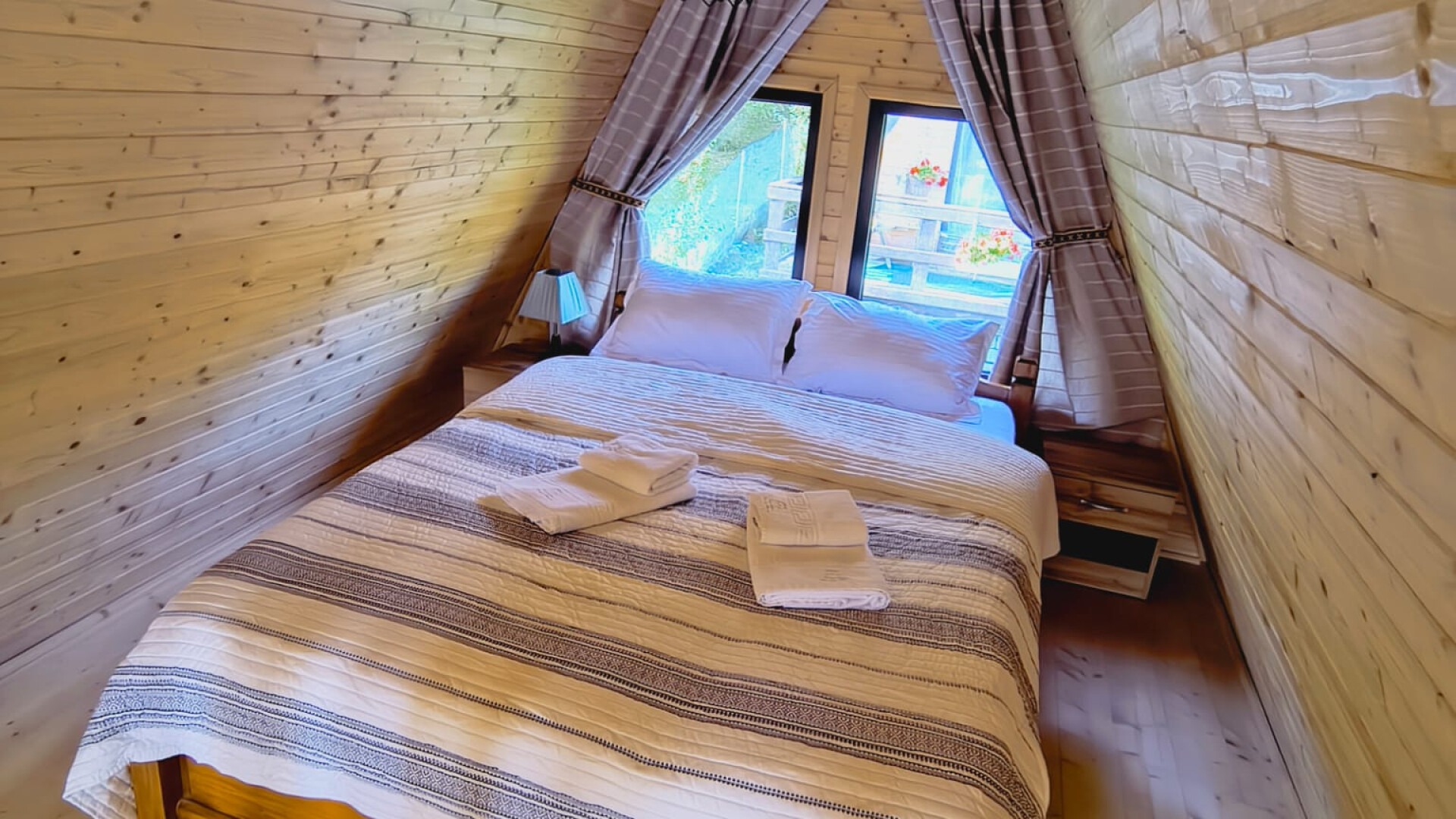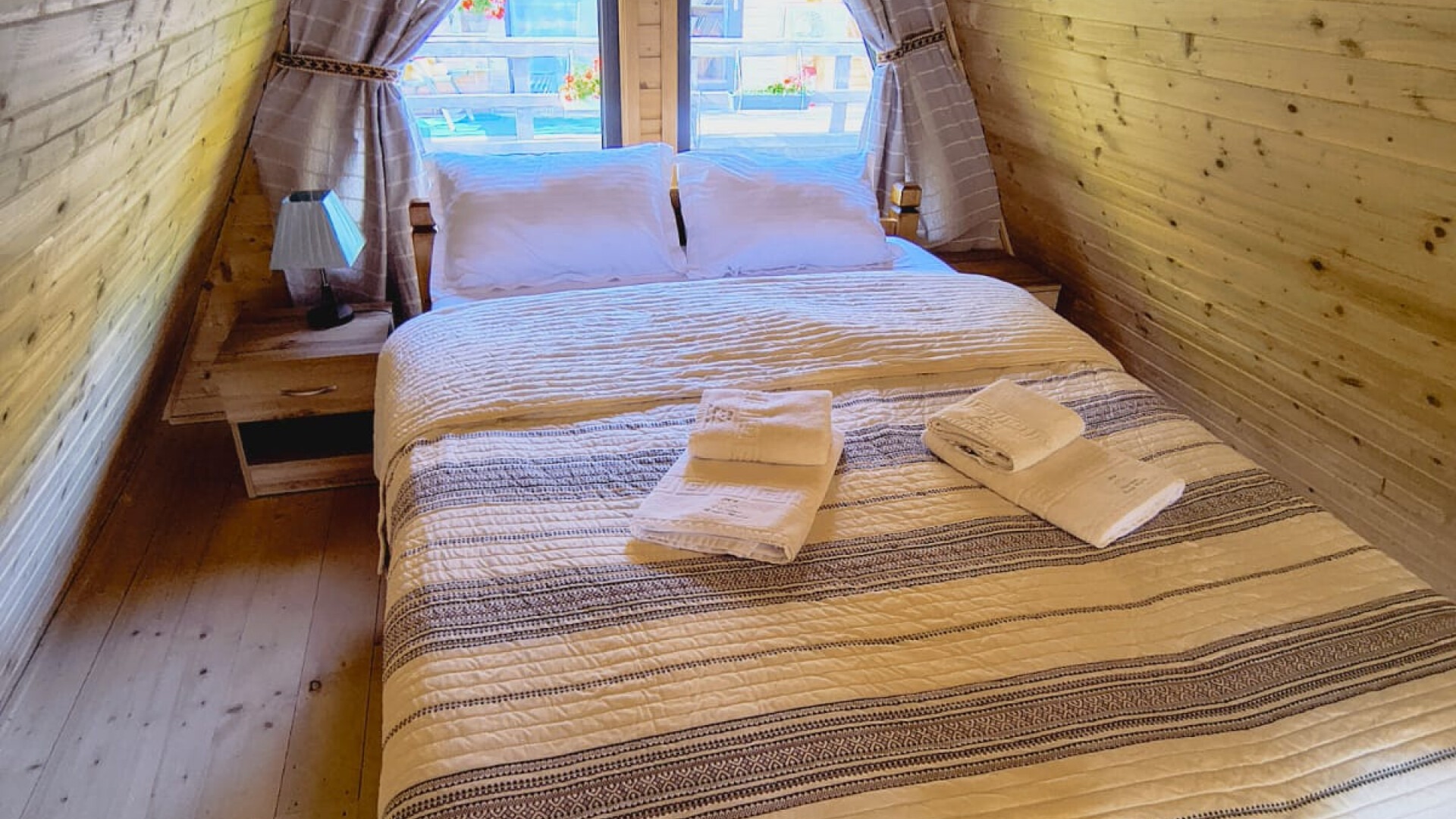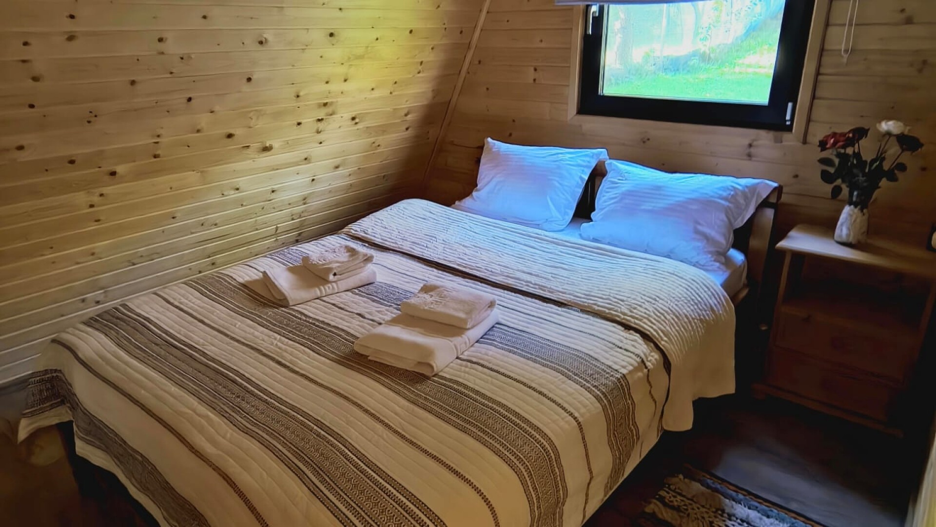 Cabana dispune de dormitor închis cu pat matrimonial și un spațiu suplimentar la etaj, cu vedere spre natură. Baia privată și sistemele de încălzire și aer condiționat asigură confort în orice sezon.