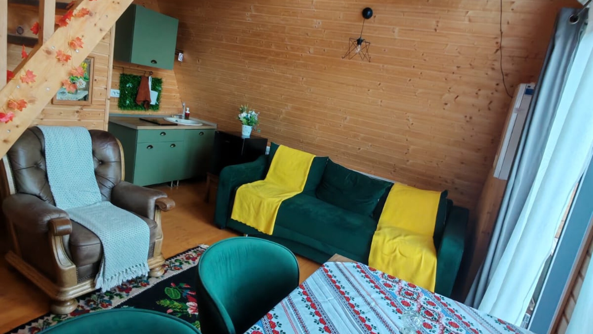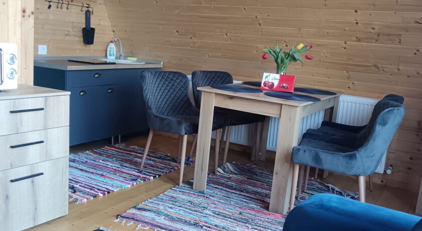 Interiorul luminos, cu fațadă integral vitrată, aduce natura în interior și creează o atmosferă relaxantă. Zona de zi include canapea confortabilă, masă pentru patru persoane și chicinetă complet utilată.